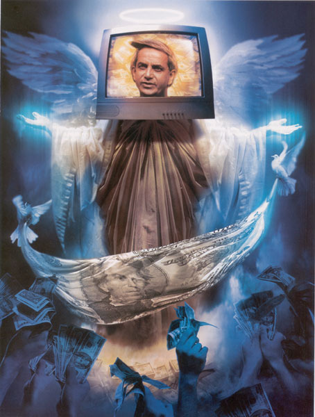 Язычество, олицетворенное в телеевангелистах — вот что телевидение выявило в самом корне нашего общества, и особенно в американской Церкви. Подобное уже случалось в Европе в XVI в., только там была другая технология — печатный станок. Новая технология приоткрыла гротескную форму язычества в Церкви, и это привело к Реформации. Доминиканский монах Йоган Тецель был лишь одним из многих, посланных Папой продавать индульгенции в попытке собрать деньги для перестройки собора св. Петра и оплаты долгов. Его послание было простым: «Дай денег и твои грехи будут прощены». Печатный станок позволил организовать массовое производство булл за короткое время. Представители Папы получили указания прибыть в город с помпезностью, имея при себе напечатанные папские буллы, дававшие разъяснения о новых индульгенциях.